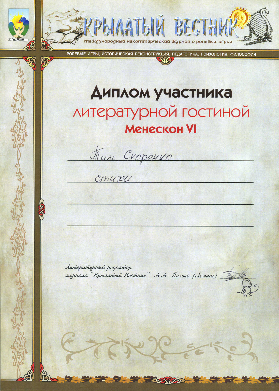Дипломант поэтического конкурса «Лужарская долночь-2013» в номинации «Мы можем делиться дыханьем и голосом»