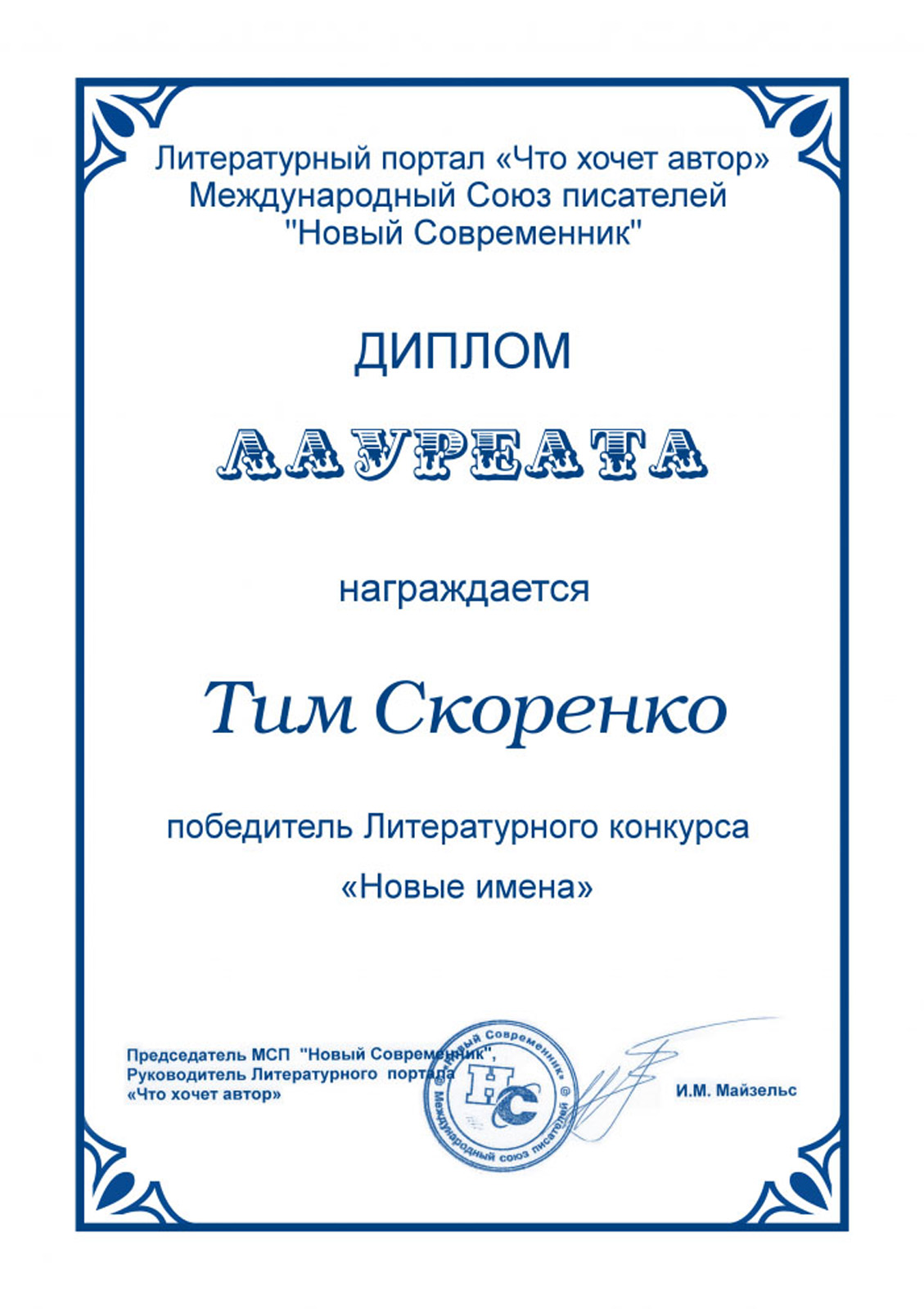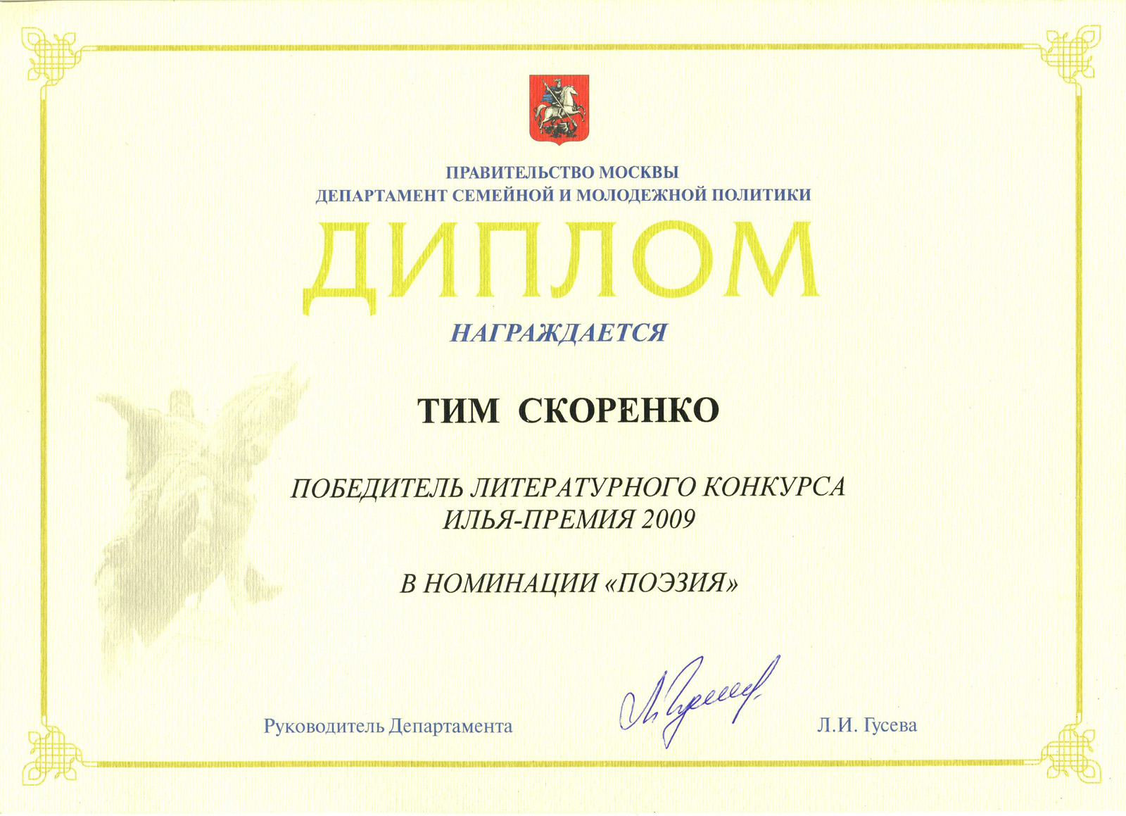 Лауреат литературного конкурса «Илья-премия-2009» в номинации «Поэзия»
