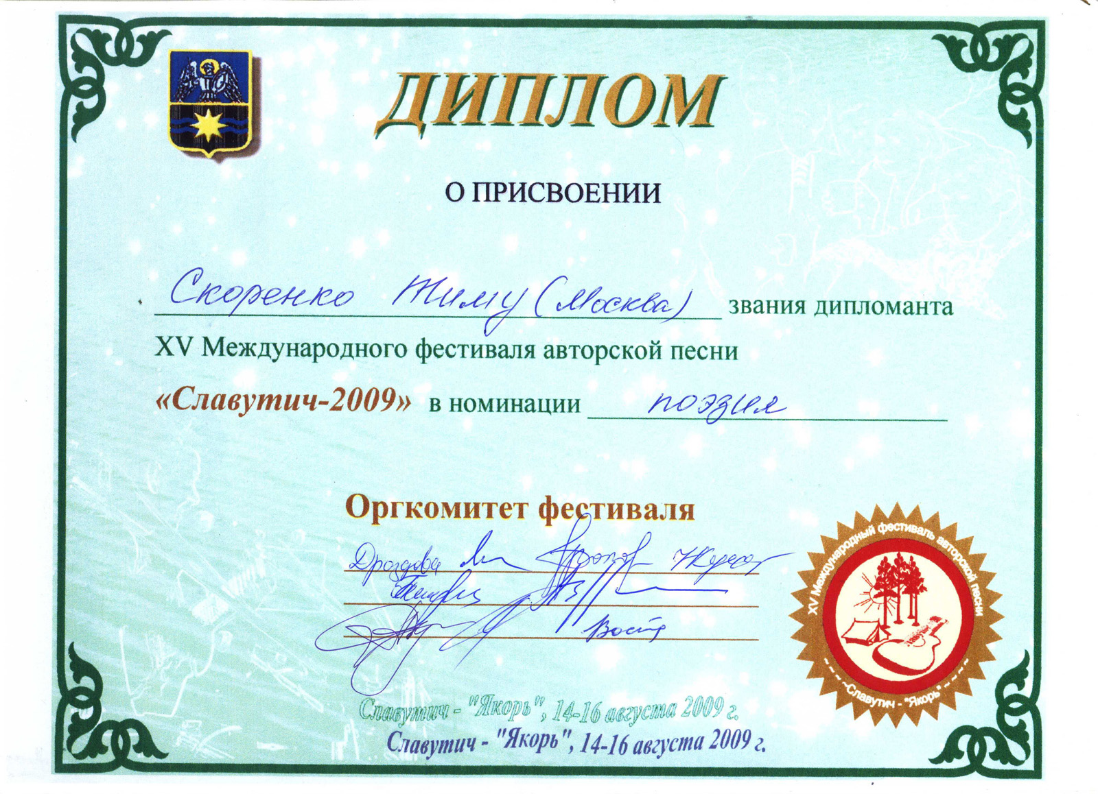 Дипломант XV международного фестиваля авторской песни «Славутич-2009» (Славутич, Украина) в номинации «Поэт»