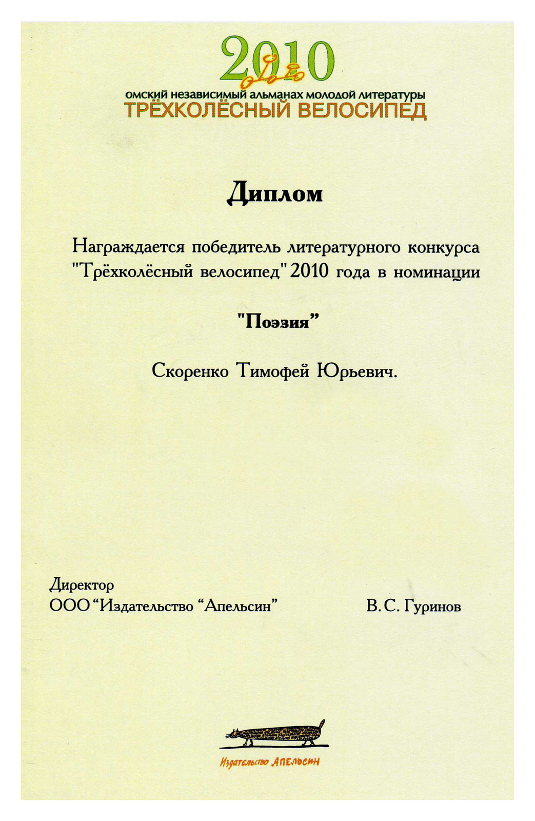 Лауреат литературного конкурса «Трёхколёсный велосипед-2010» в номинации «Поэзия»