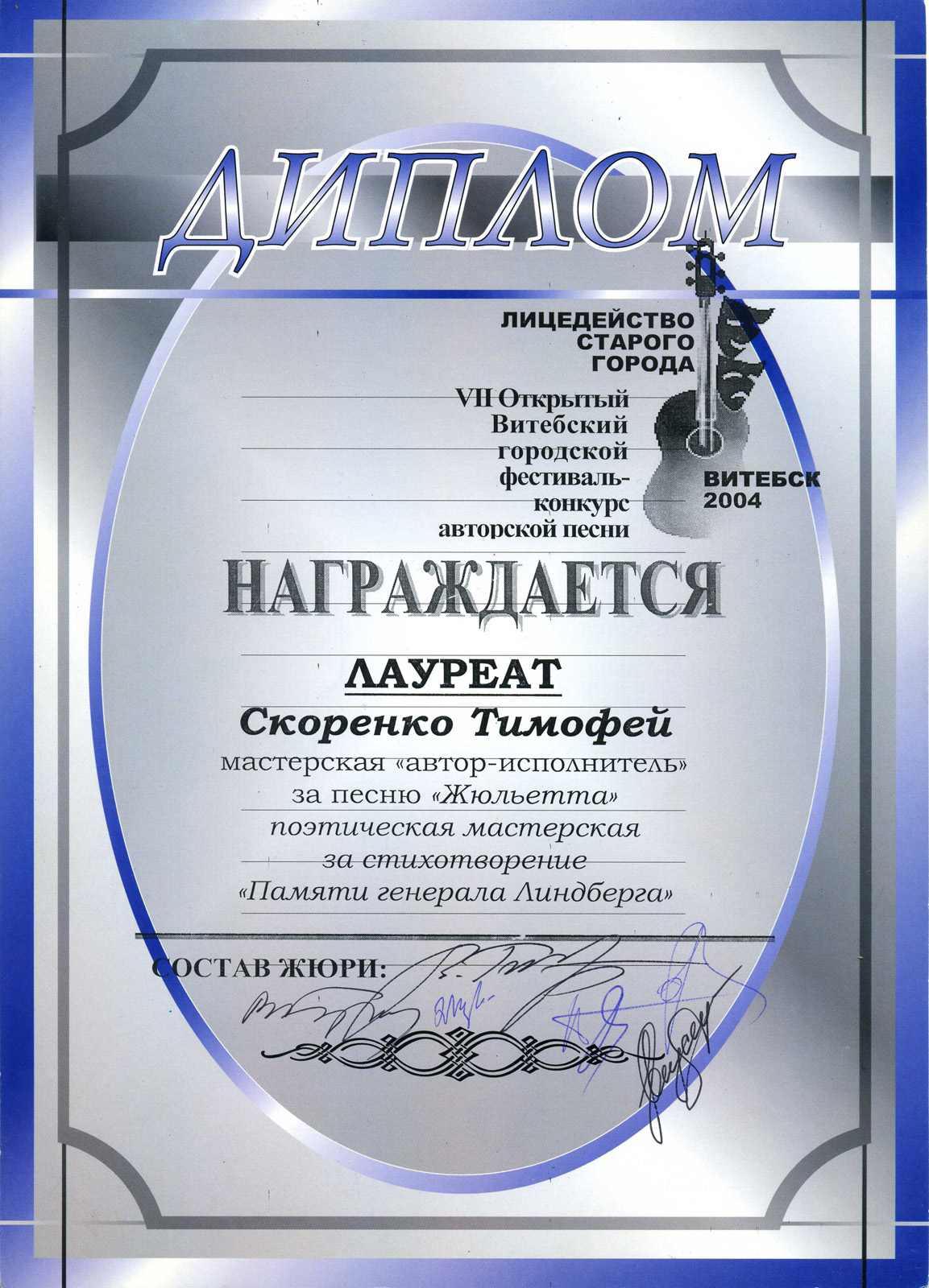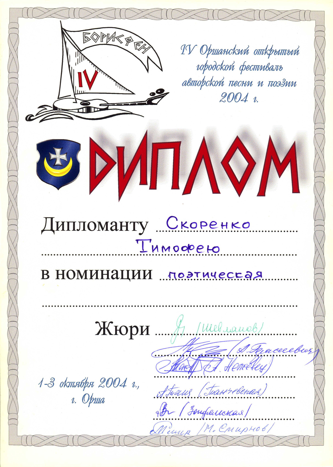 Дипломант IV открытого городского фестиваля авторской песни и поэзии «Борисфен-2004» (Орша) в номинации «Поэт»