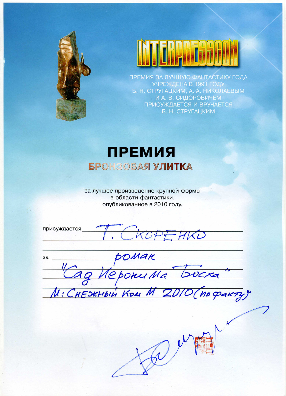«Сад Иеронима Босха». Премия «Бронзовая улитка», 2011. Лауреат в номинации «Крупная форма».