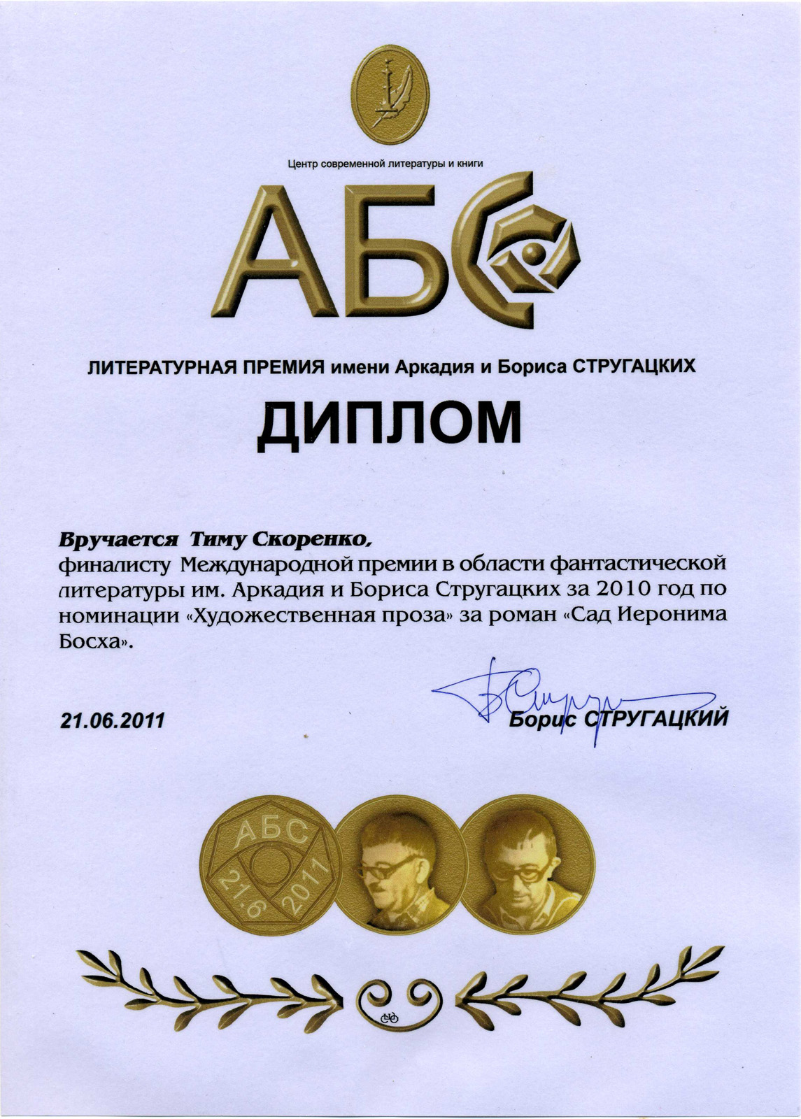 «Сад Иеронима Босха». Премия «Бронзовый Кадуцей», 2011. Лауреат в номинации «Лучший роман».
