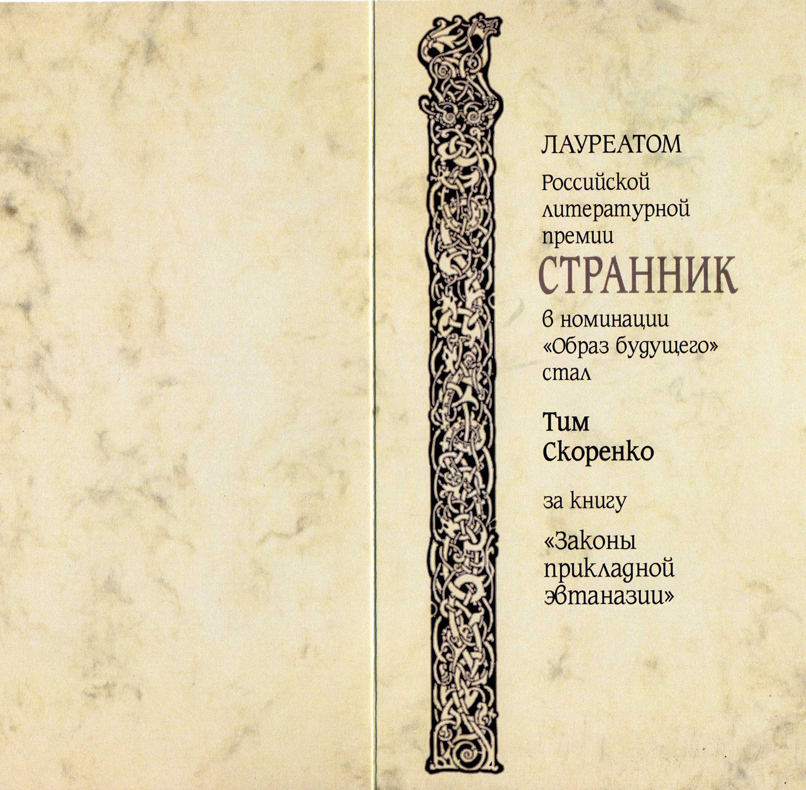«Законы прикладной эвтаназии». Премия «Странник», 2012. Лауреат в номинации «Образ будущего».