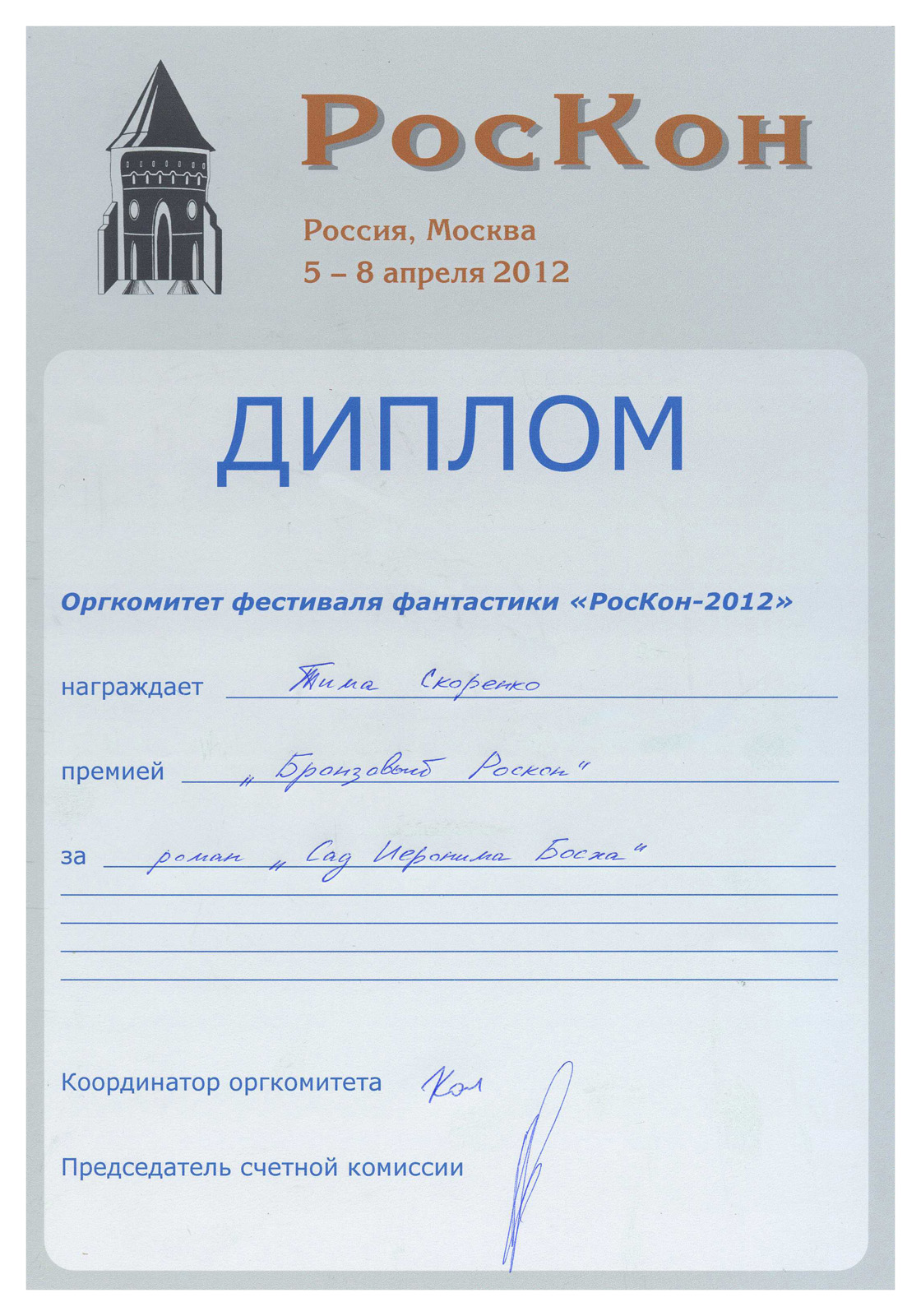 «Сад Иеронима Босха». Премия «Бронзовый Роскон», 2012. Лауреат в номинации «Роман».