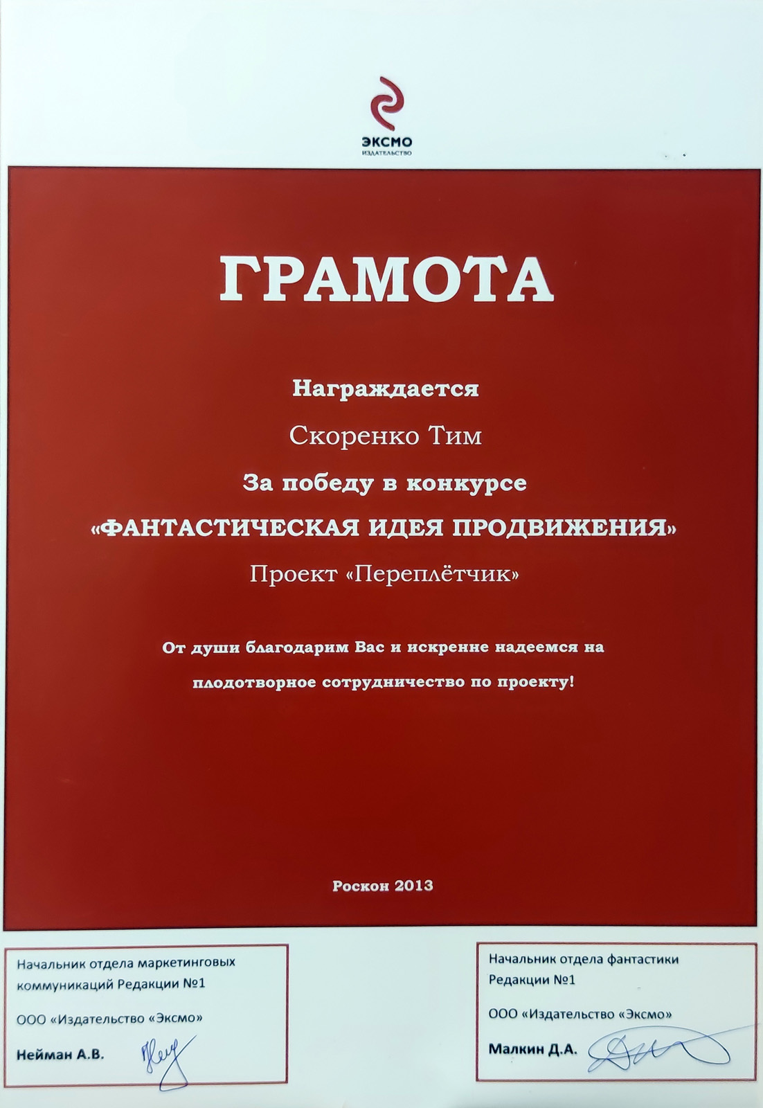 2. Почётная отметка на конкурсе «Intel» (осень 2007) за рассказ «Измени мир»