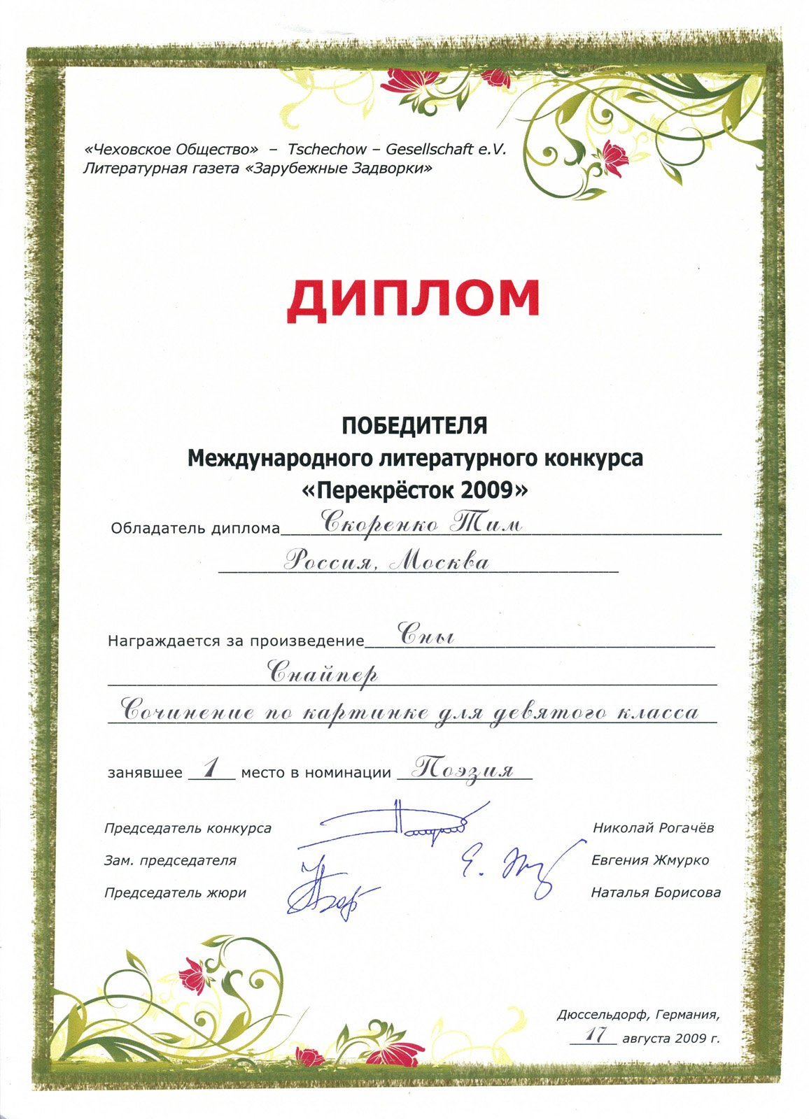 Дипломант XV международного фестиваля авторской песни «Славутич-2009» (Славутич, Украина) в номинации «Поэт»