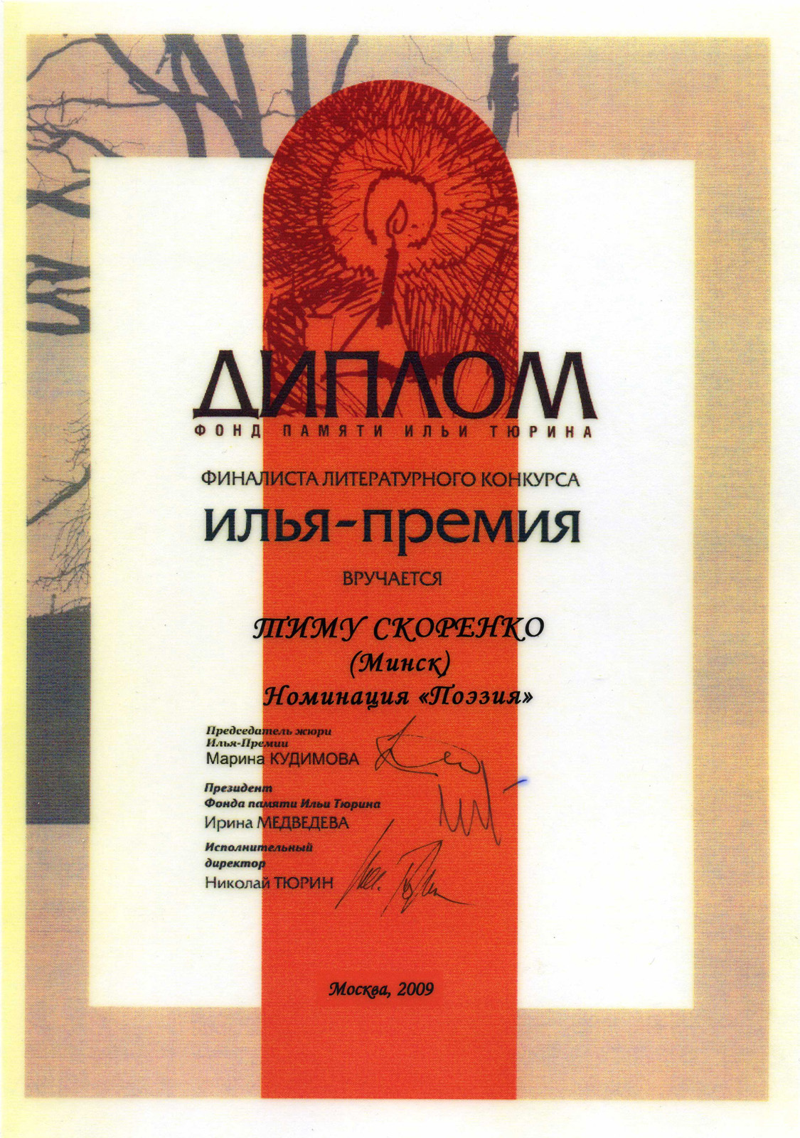 Лауреат литературного конкурса «Илья-премия-2009» в номинации «Поэзия»