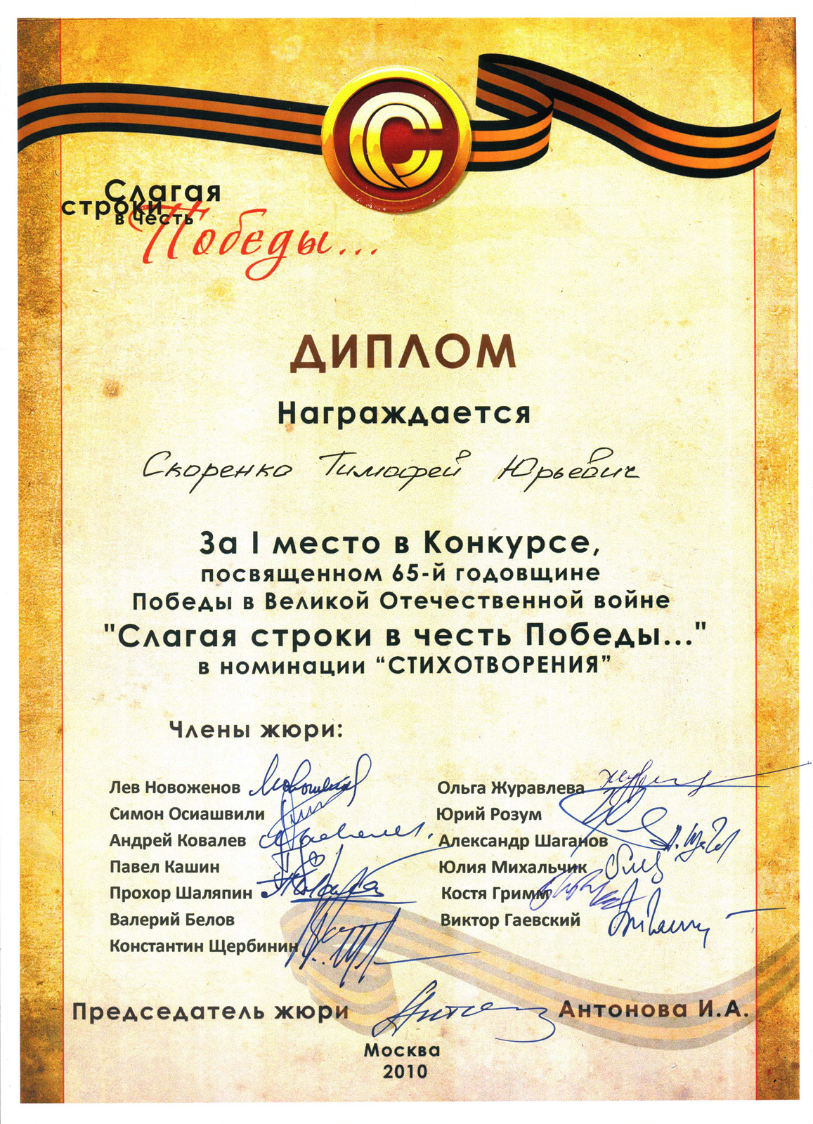 Лауреат конкурса, посвящённого 65-й годовщине победы в ВОВ, «Слагая строки в честь Победы...» в номинации «Поэзия»