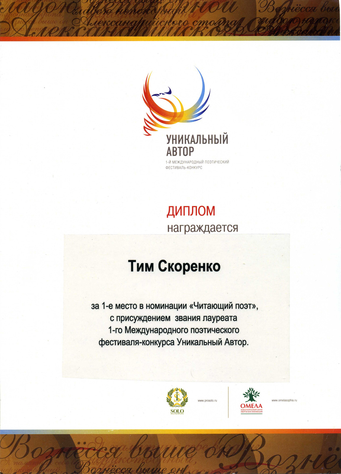 Лауреат I степени I международного поэтического фестиваля-конкурса «Уникальный автор-2010» в номинации «Читающий поэт»