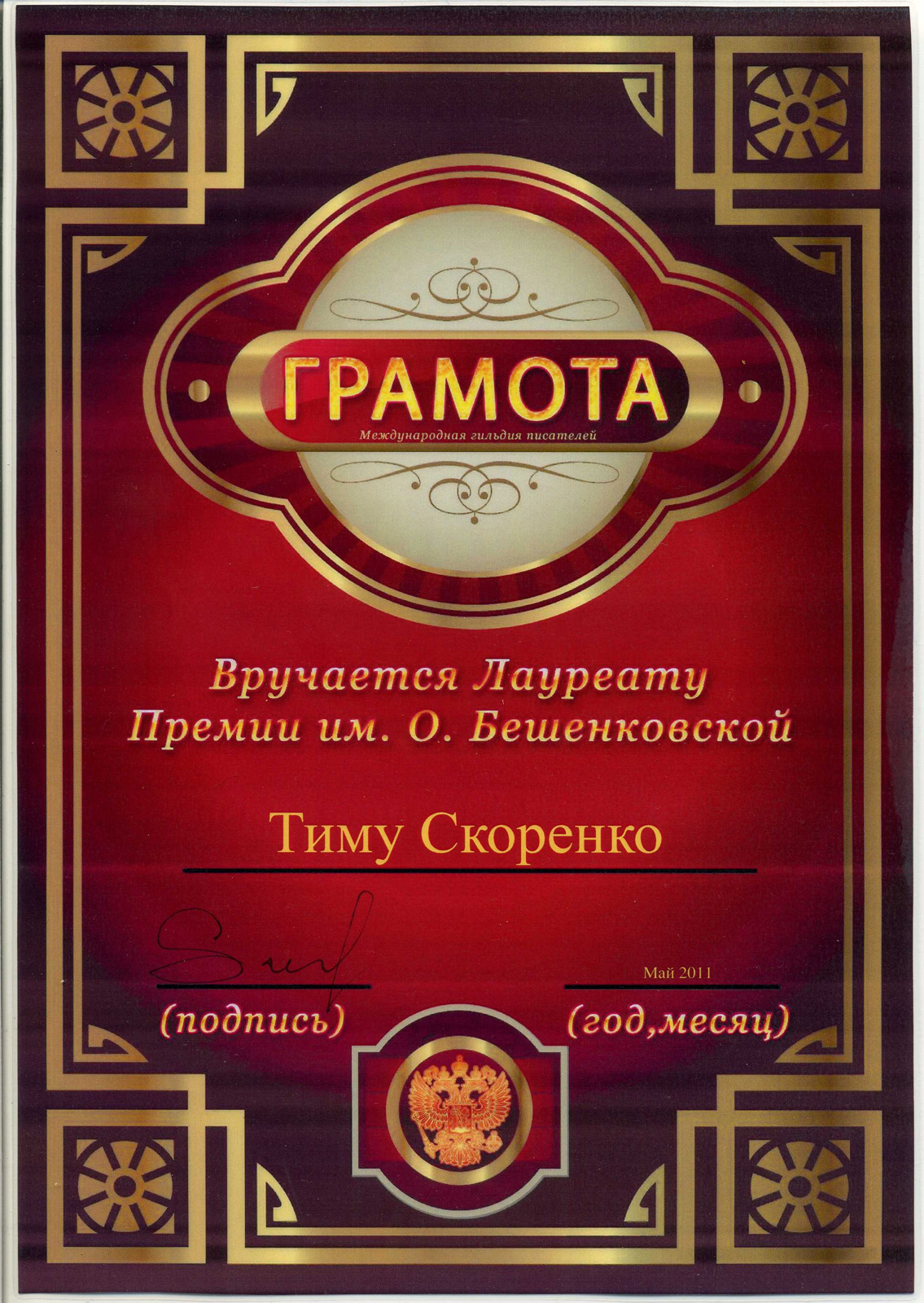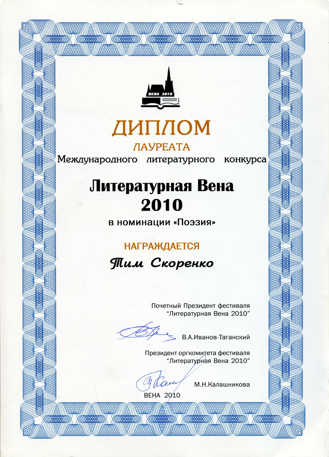 Лауреат литературного конкурса «Литературная вена-2010» в номинации «Поэзия».