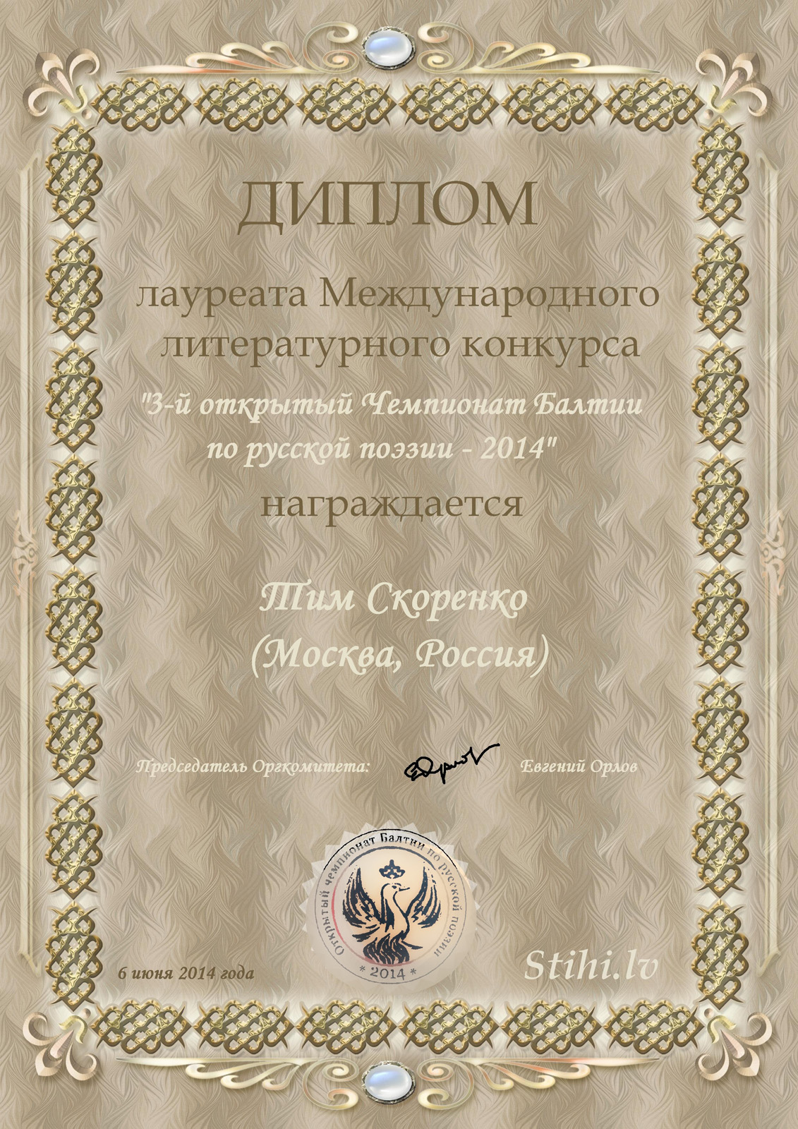 Лауреат Международного литературного конкурса «3-й открытый чемпионат Балтии по русской поэзии-2014».
