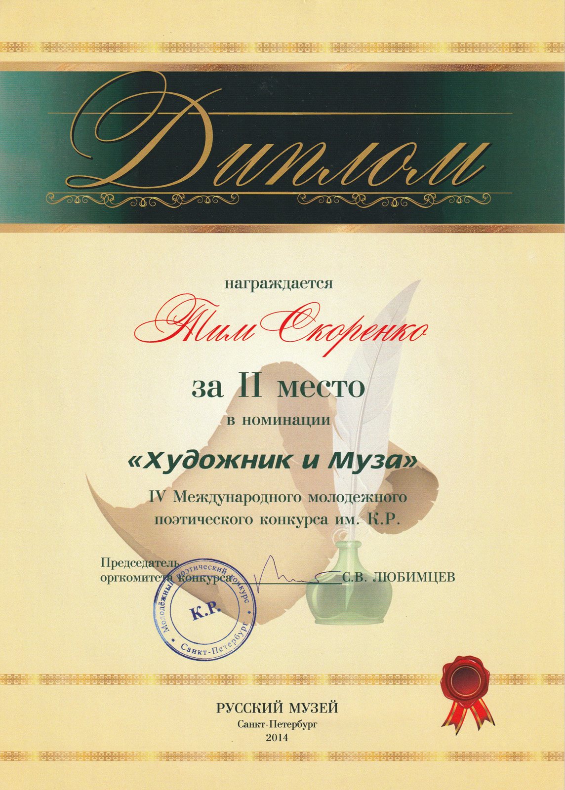 Дипломант III Международного молодежного поэтического конкурса имени К.Р. (2013) в номинации «Романс».