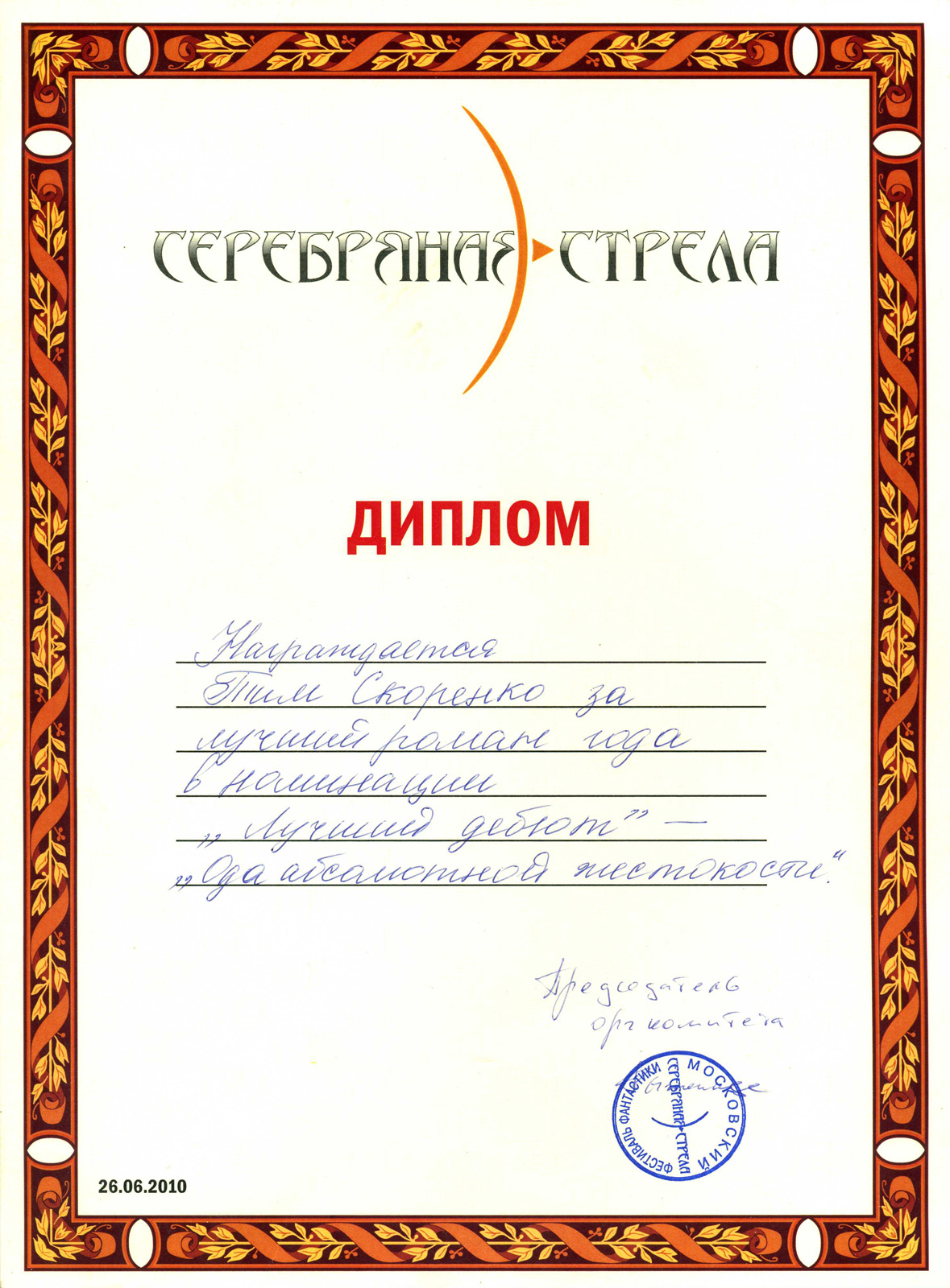 «Ода абсолютной жестокости». Премия «Серебряная стрела», 2010. Лауреат в номинации «Лучший дебют».