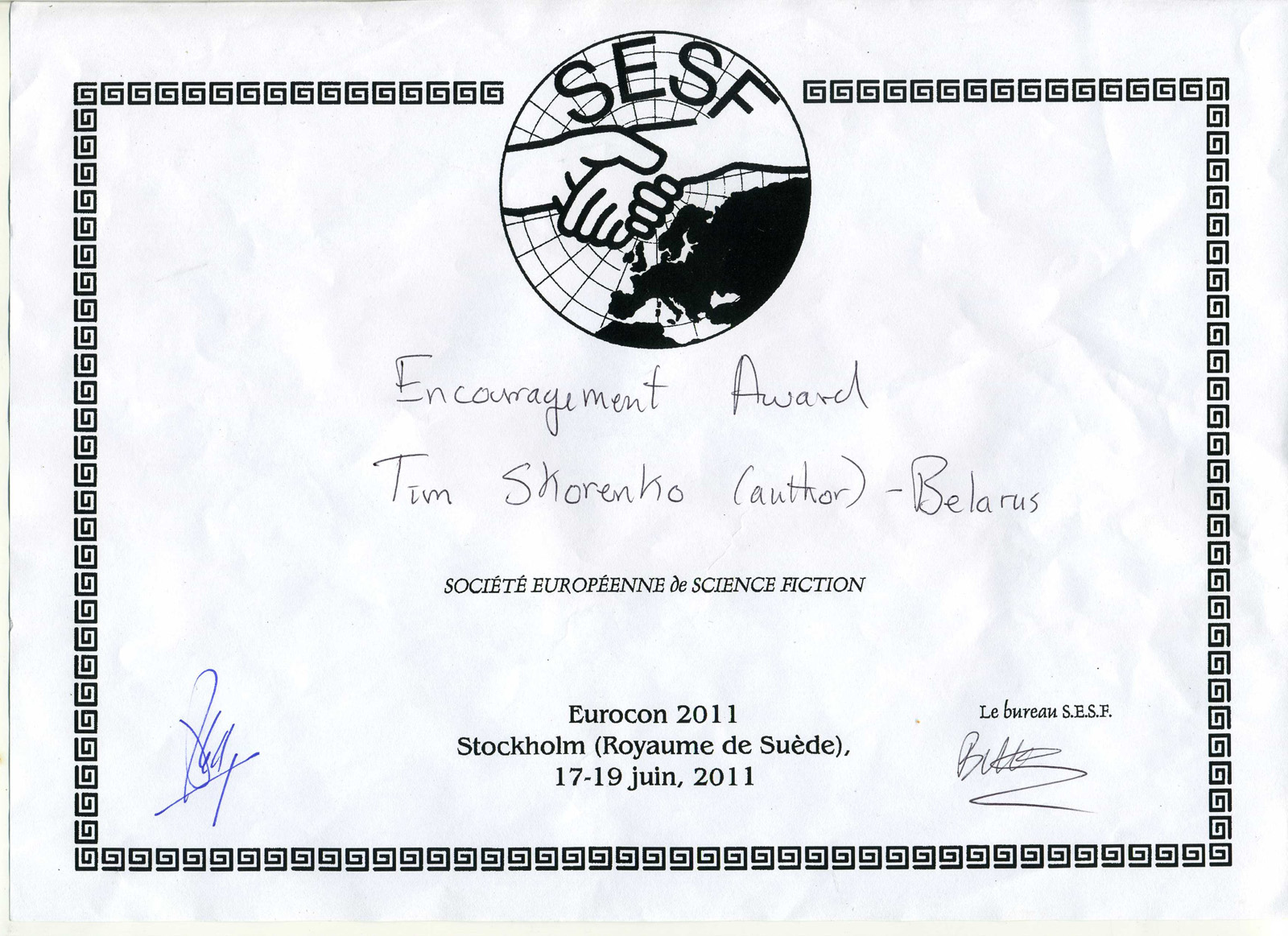 Премия «Еврокон» (EuroCon / ESFS Awards), 2011. Лауреат в номинации «Лучший дебют».
