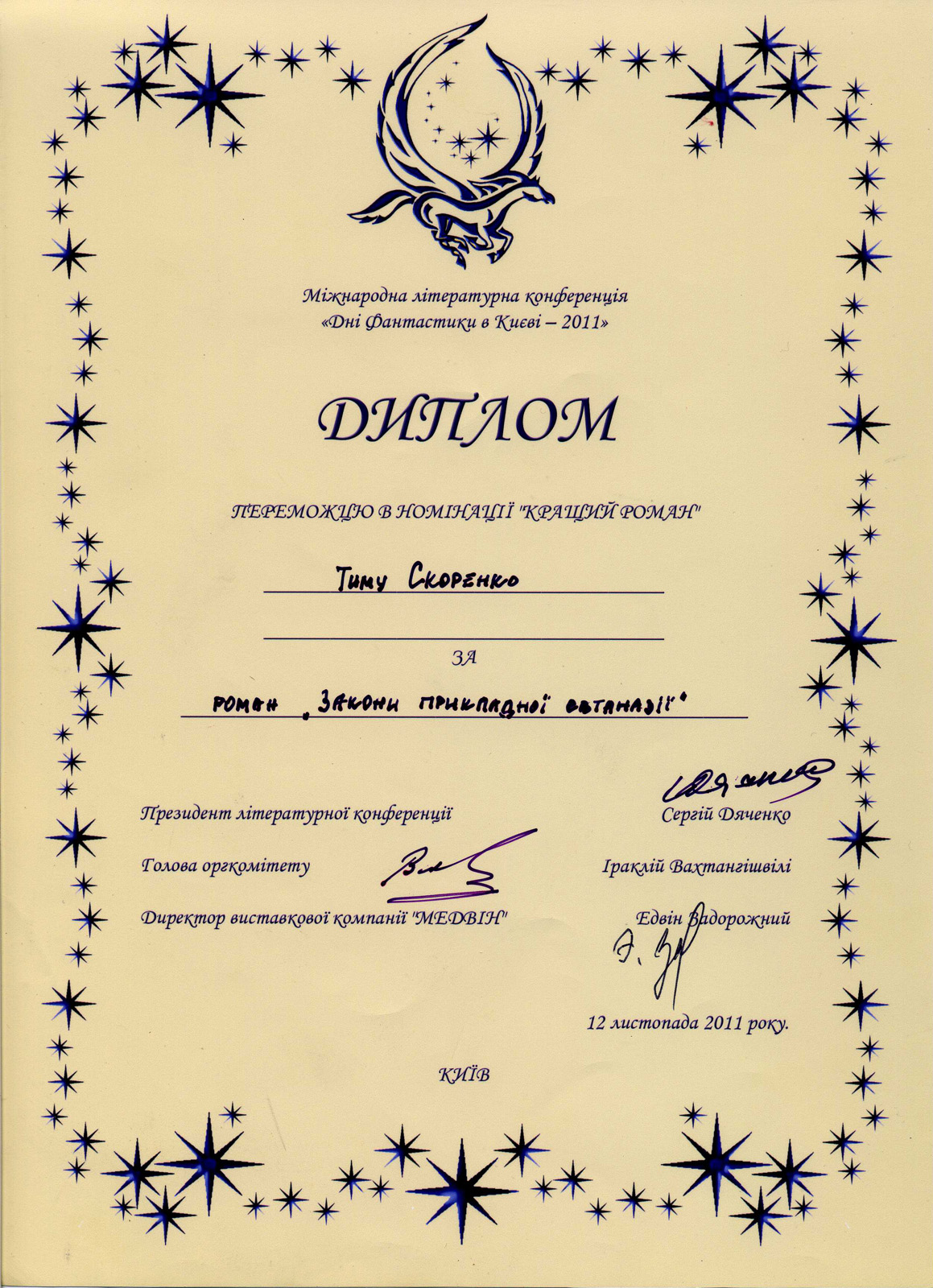 «Законы прикладной эвтаназии». Премия «Дни фантастики в Киеве», 2011. Лауреат в номинации «Роман».