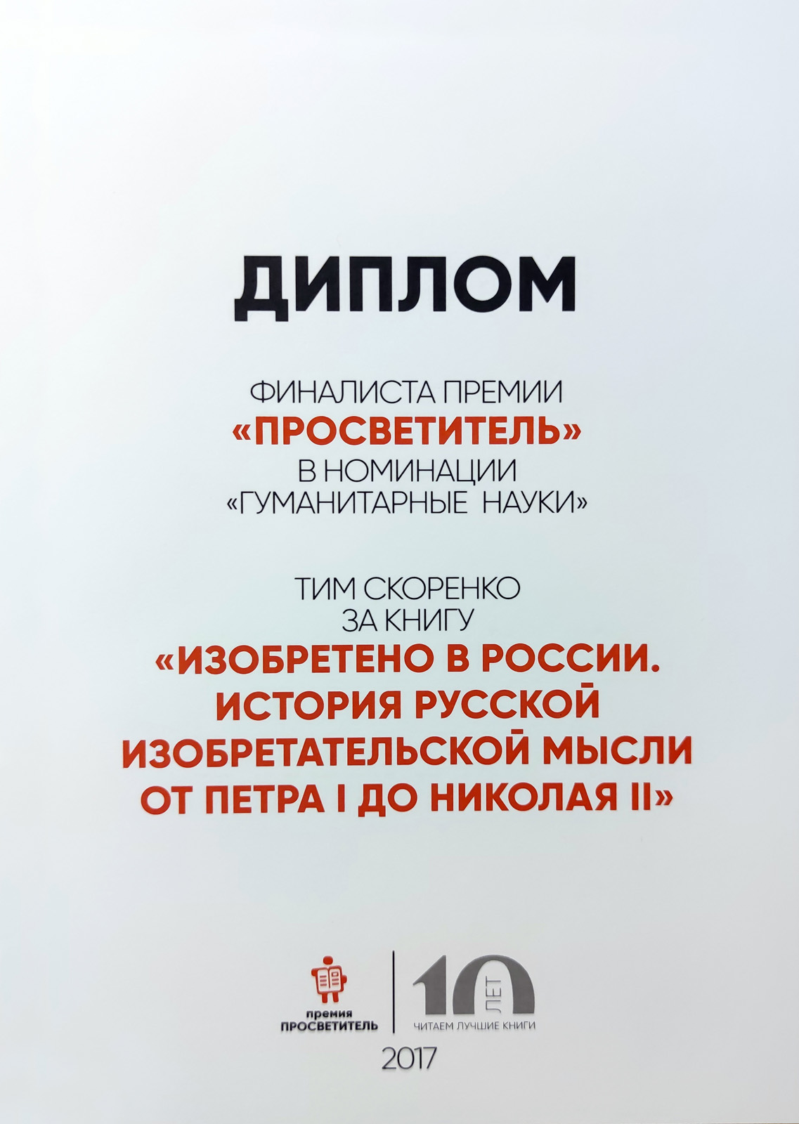 «Изобретено в России: история русской изобретательской мысли от Петра I до Николая II». Премия «Просветитель», 2017 // Гуманитарные науки. Шорт-лист.